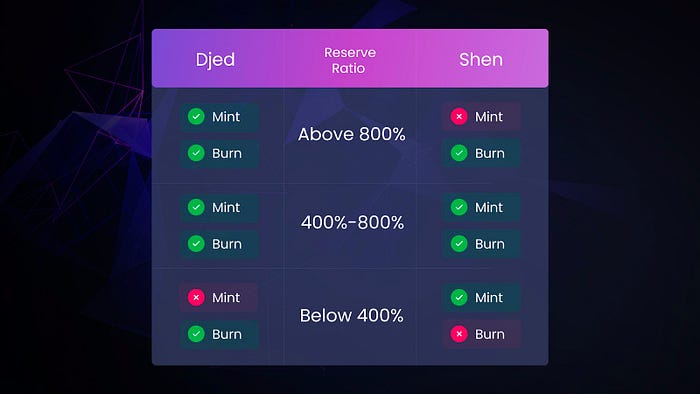 DJED is pegged to USD, backed by the base coin ADA, which is an independent asset, and uses SHEN as its reserve coin. In a case where the reserve ratio drops below 400%, the platform will prevent the burning of SHEN, and the minting of new DJED (since there is not enough collateral in the reserve). In the case that the ratio goes over 800%, users will not be able to mint any more SHEN, however, they will still be able to mint and burn DJED. In any scenario, DJED is always redeemable.