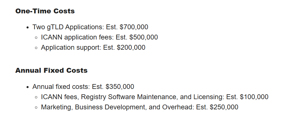 Die jährlichen Fixkosten werden auf 350.000 $ geschätzt, einschließlich ICANN, Wartung und Lizenzierung des Registers, Marketing, Geschäftsentwicklung und Gemeinkosten. Die variablen Ausgaben richten sich nach den Verkäufen in der Domäne und werden voraussichtlich durch die Einnahmen kompensiert. Es werden keine eigenen Mittel beantragt.