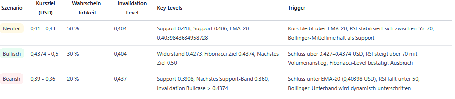 In den letzten 12–24 Stunden bewegte sich der Kurs zwischen 0,3908 USD und 0,4273 USD (High/Low der letzten sechs 4h-Candles). Der letzte Schlusskurs liegt bei 0,4208 USD und damit leicht unter dem vorherigen 4h-Schluss von 0,4238 USD, aber deutlich über dem Schluss vor 24 Stunden (0,4062 USD). Die Marktkapitalisierung beträgt derzeit etwa 15.453.000.000 USD.
