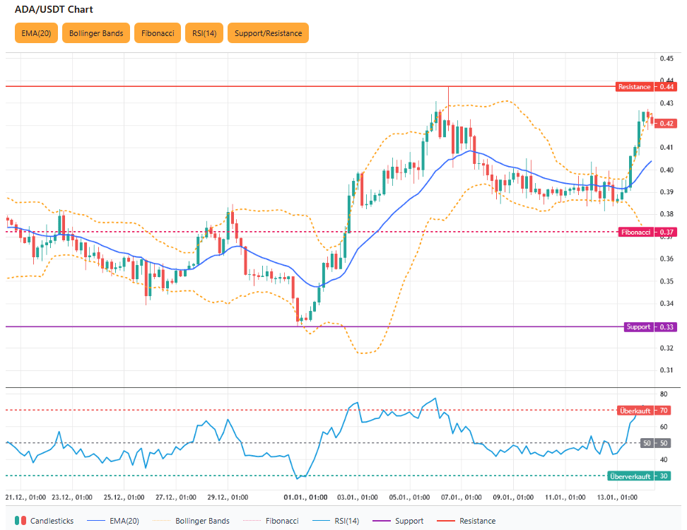 Kurzfristig bleibt die Prognose für ADA am 14.01.2026 leicht bullish: Kurs über EMA‑20, steigender RSI und eng definierte Unterstützungen. Unterstützungen liegen bei 0,418 USD und 0,406 USD; Widerstände bei 0,427 USD und 0,4374 USD. Ein nachhaltiger Ausbruch über 0,4374 USD könnte weiteres Momentum bis ~0,50 USD freisetzen, während ein Bruch unter 0,403 USD (EMA‑20) das Risiko einer Abwärtswelle und Test der 0,36 USD‑Zone erhöht.