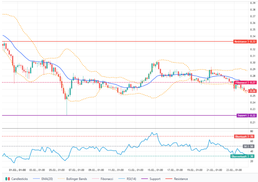 Kurzfristig bleibt die Prognose neutral bis leicht bearish: Momentum ist schwach, RSI überverkauft und der Kurs notiert unter dem EMA‑20. Unterstützungen liegen bei 0,2558 USD und 0,2504 USD; Widerstände bei 0,2680 USD und 0,2701 USD.