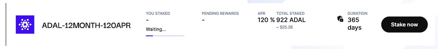 Here you will see available staking pools. In this example, you can see our ADALend (ADAL) three staking pools with different staking periods and APRs.
