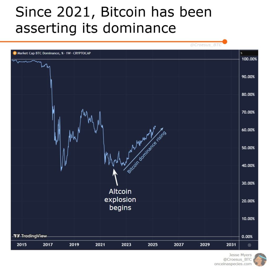 L'analyste de Crypto, Jesse Myers, a souligné trois raisons clés pour lesquelles Bitcoin gagne le match contre Altcoins, conduisant à une altes de saison retardée. Il explique trois raisons clés pour lesquelles BTC a solidifié sa position de marché.