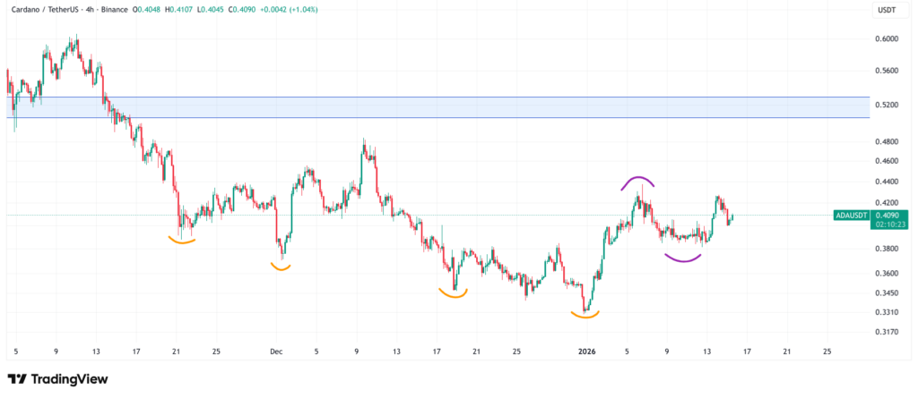 Om dat beter te analyseren moeten we even inzoomen. Hieronder zien we de 4-uurs grafiek van ADA. Op die manier krijgen we een beter beeld hoe de munt zich beweegt op korte termijn.
