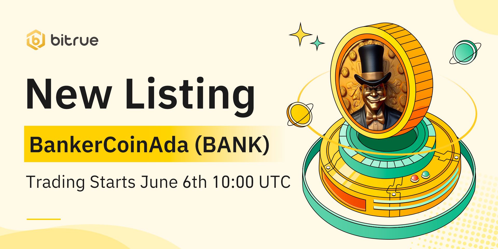 Bitrue will list BankerCoinAda (BANK). Trading will open for BANK/USDT trading pair at 2023-06-06 10:00 (UTC).