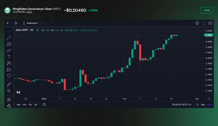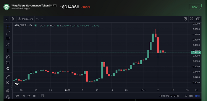 One of the key new updated tools on WingRiders interface are the graphs, which allow Riders to monitor and analyze the assets’ price movement, TVL and trading volume within pools to develop trading strategies over time. With these charting tools, it is possible to create charts and customize technical indicators for: