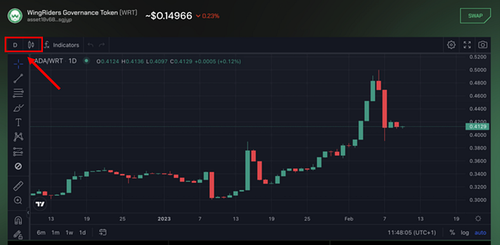 Riders can customize the Trading Graph on WingRiders to suit their preferences. They can change the time frame of the graph by selecting a preset time frame (e.g., 1 hour, 1 day, 1 week, etc.) or by selecting a custom time frame. They can also change the type of chart (e.g., candlestick, line, area, etc.) and adjust the colors and thickness of the chart lines.