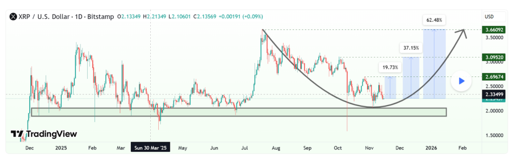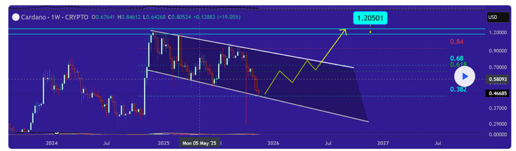 Cardano has seen steady accumulation in November and now trades near $0.46 with a market cap above $16.5 billion. TradingView data shows ADA reaching a three-year high in total value locked, a quiet but important sign that builders and liquidity providers remain active. This gives a supportive backdrop for any Cardano Price Prediction focused on a recovery.
