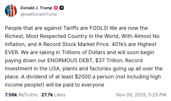 While the plus side is that the US government may pay each American a stimulus check that many desperately need during the current affordability crisis, the flip side is that the tariff war is likely to drag on, and the economy may come under pressure soon enough.