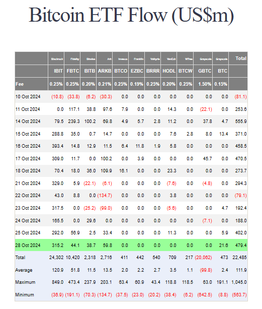 Les experts et les observateurs du secteur affirment que la récente percée du Bitcoin est liée à l’augmentation des afflux dans les ETF Bitcoin et à l’enthousiasme suscité par les élections présidentielles américaines du 4 novembre favorisant l’industrie de la cryptographie. Malgré les mouvements irréguliers des prix du Bitcoin ces derniers jours, Bitcoin repose actuellement sur un sentiment haussier.