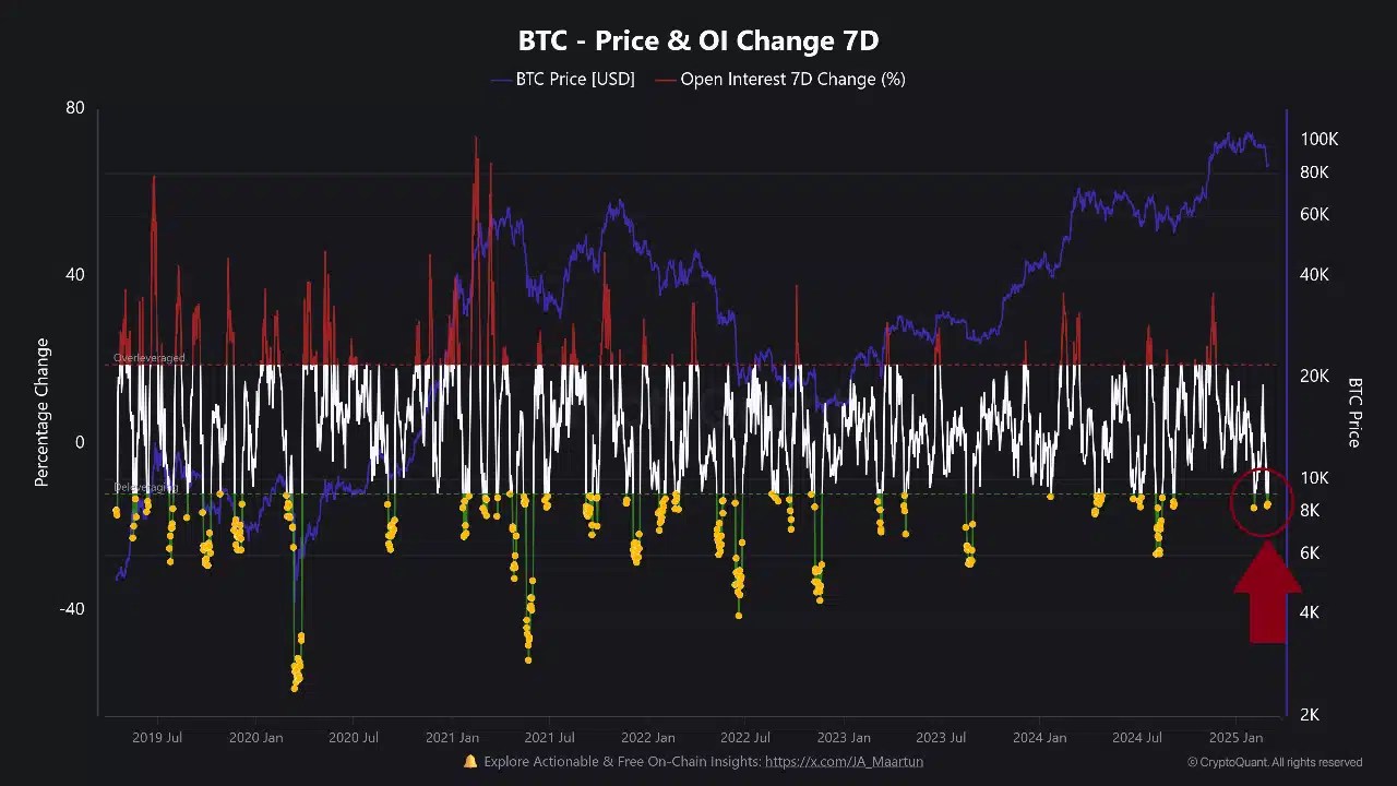 Les intérêts ouverts mesurent le nombre total de contrats dérivés en cours, et une forte diminution suggère souvent des liquidations de position ou une participation réduite du marché.