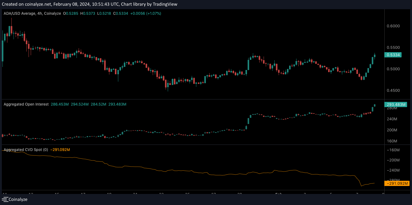 Para que a ADA chegue a US$ 0,68, os compradores precisam suportar essa agressão dos vendedores. Nesse ínterim, o Open Interest (OI) parecia estar apoiando o aumento de preço do Cardano.