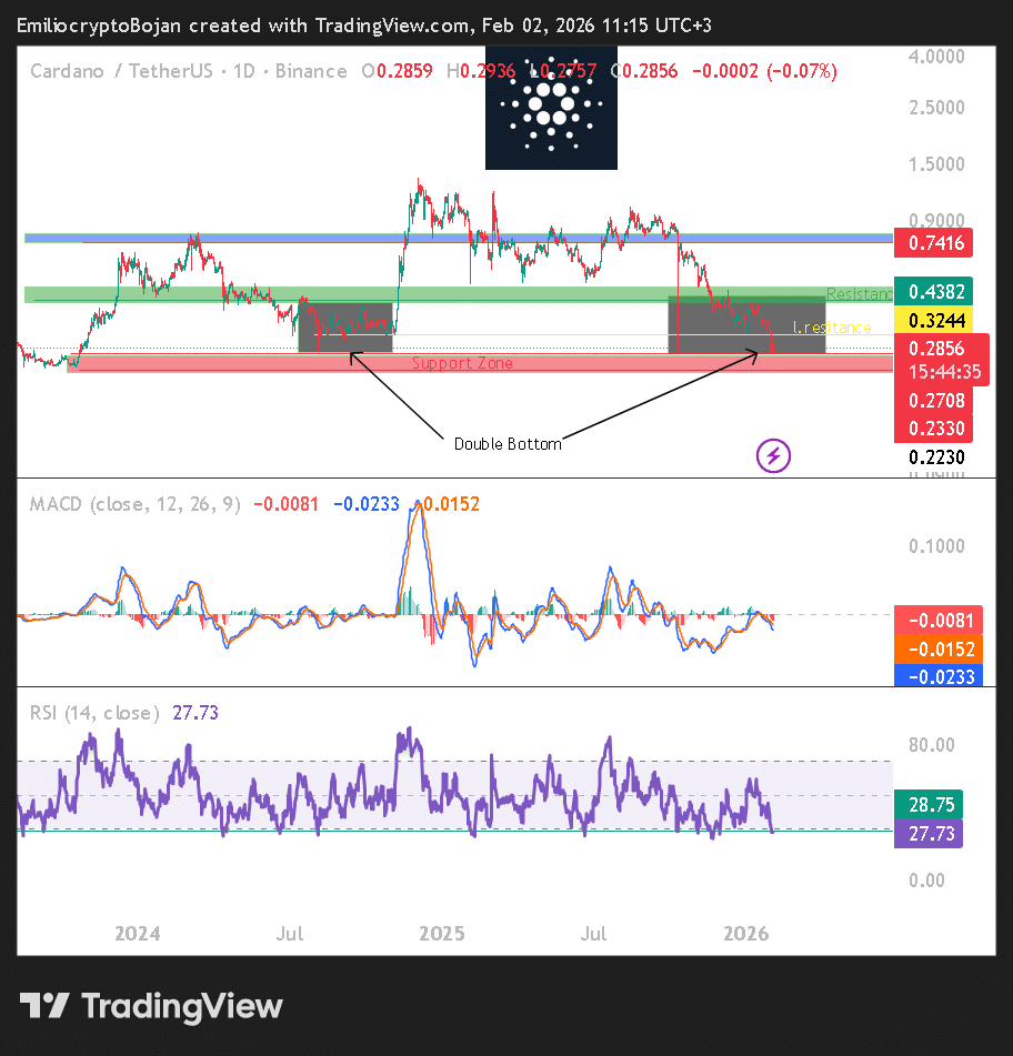 Il a ensuite rebondi à 0,28 $ alors qu'ADA recherchait la stabilité, suscitant des inquiétudes sur le marché. Bien que le RSI soit inférieur à 30, un niveau qui a marqué tous les creux en dessous de 0,30 $, chaque rebond précédent a été volatil.