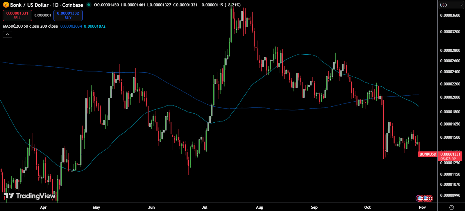 Cardano is not the only OG token experiencing difficulties right now; even Bonk coin, the meme coin giant, appears to have been having trouble reclaiming old highs. Despite starting off what looked like a major recovery run some days ago, chart analysis shows that the movement appears to have run out of steam, with the Bonk coin price now very close to where it was before.