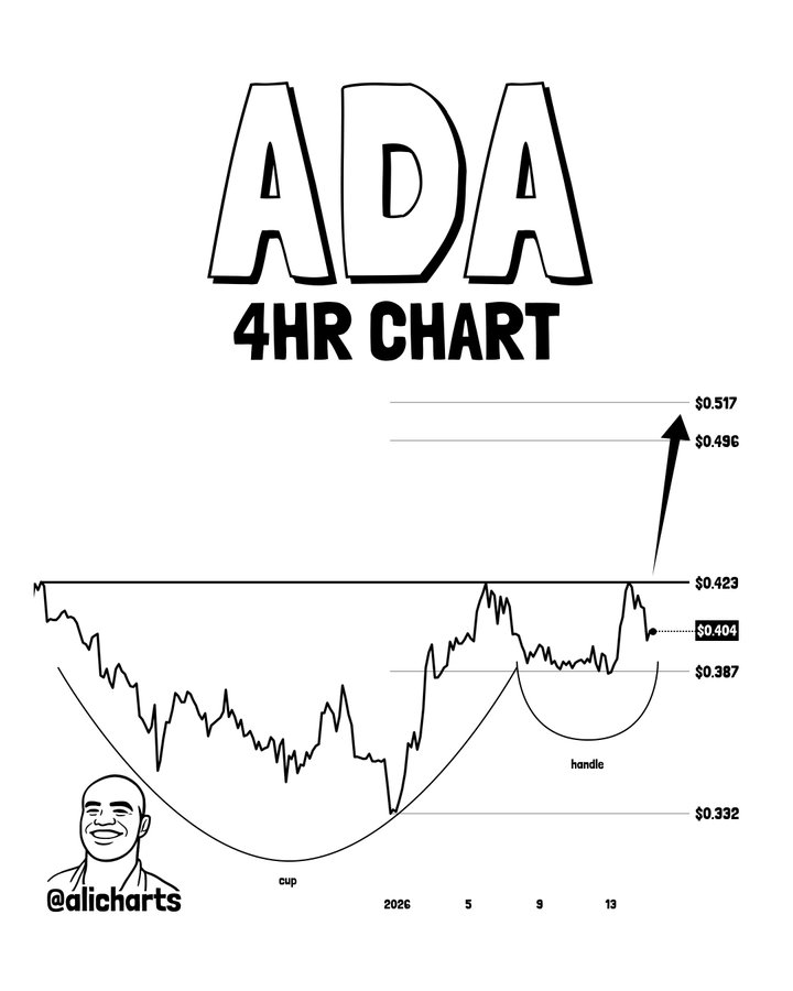 Therefore, ADA is eyeing the $0.423 resistance, with a sustained break potentially confirming a cup-and-handle pattern and targeting $0.517, while trading around $0.3716 per CoinGecko data.