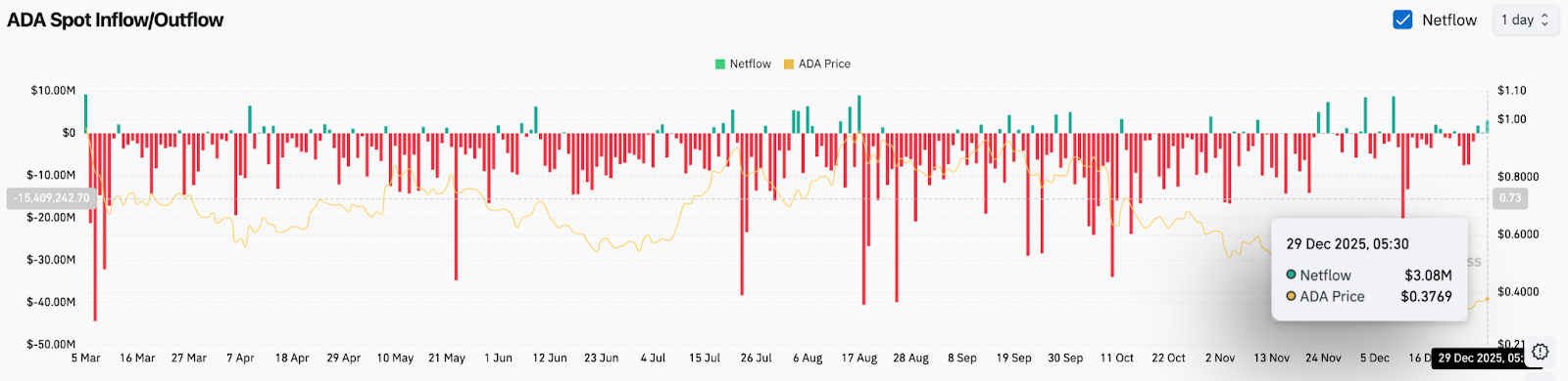 Os fluxos do mercado à vista indicam leve melhora após semanas de saídas contínuas. Em 29 de dezembro, ADA registrou entrada de US$3,08 milhões, rompendo o padrão de distribuição observado ao longo do quarto trimestre. Embora um único dia não represente acumulação, ele sugere redução da força vendedora nesse nível.