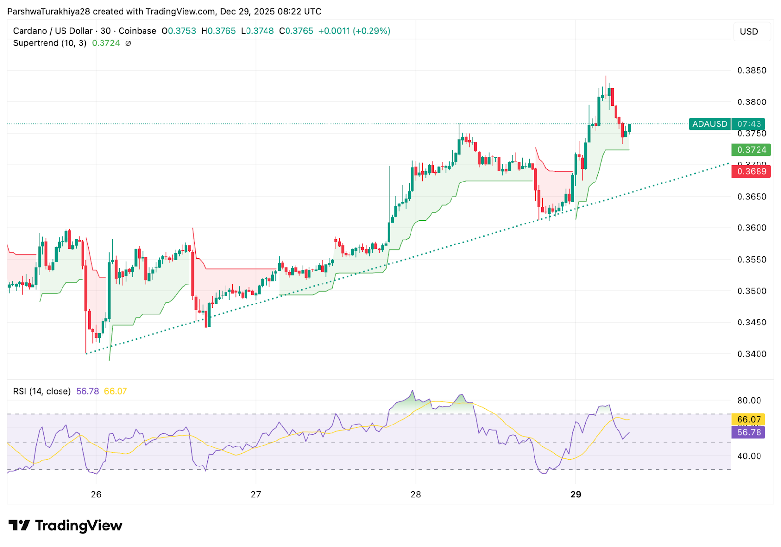 No gráfico de 30 minutos, ADA rompeu o Supertrend de curto prazo na região de US$0,372. Além disso, o preço segue apoiado em uma linha de tendência ascendente intradiária. O RSI moveu-se para a faixa dos 50 pontos, indicando fôlego comprador sem excesso.