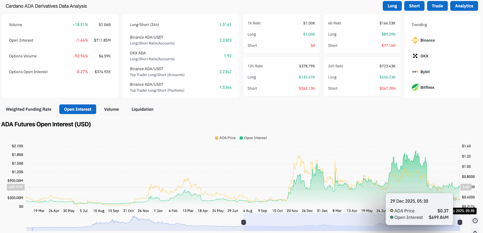 O preço da Cardano opera próximo de US$0,376 após leve repique a partir das mínimas de dezembro. Esse movimento mostra entrada inicial de compradores, embora o cenário amplo permaneça pressionado. ADA segue abaixo das médias móveis principais, o que mantém o viés de baixa no curto e no médio prazo.
