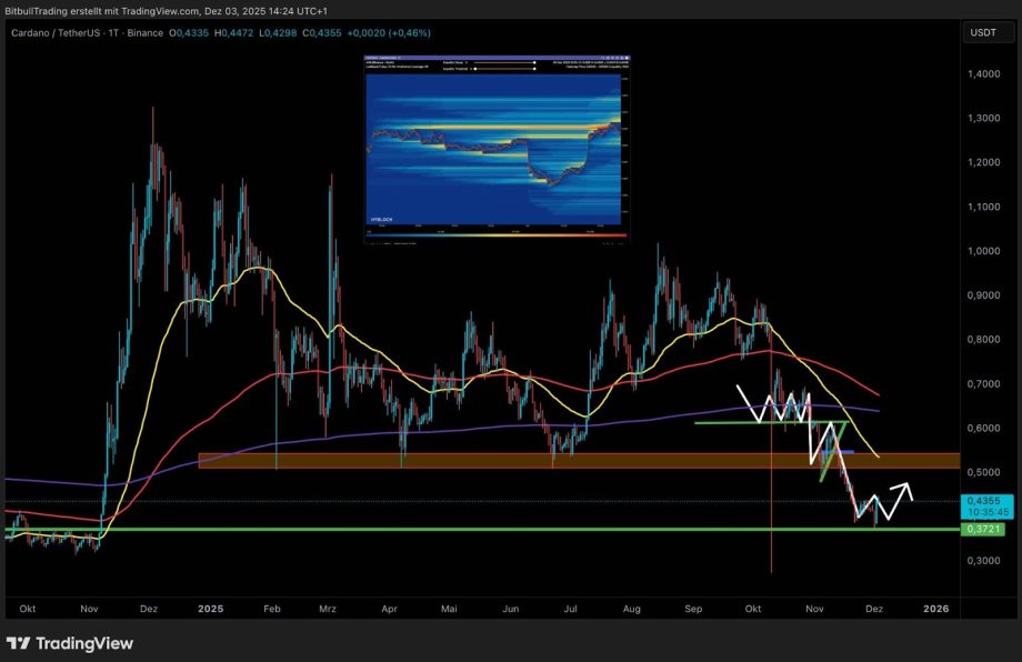 Im 4-Stunden-Chart präsentiert ADA derzeit ein konstruktives Bild. Der Kurs bildet auf dem bestehenden Support eine potenzielle W-Formation aus, die, sofern Bitcoin seine Erholungsstruktur beibehält, als Grundlage für eine weiterführende Aufwärtsbewegung dienen kann. Ein erster relevanter Zielbereich liegt im Umfeld des 200 EMA, die als nächster signifikanter Widerstand fungiert. Dort könnte ADA zunächst in eine Phase der Konsolidierung übergehen.