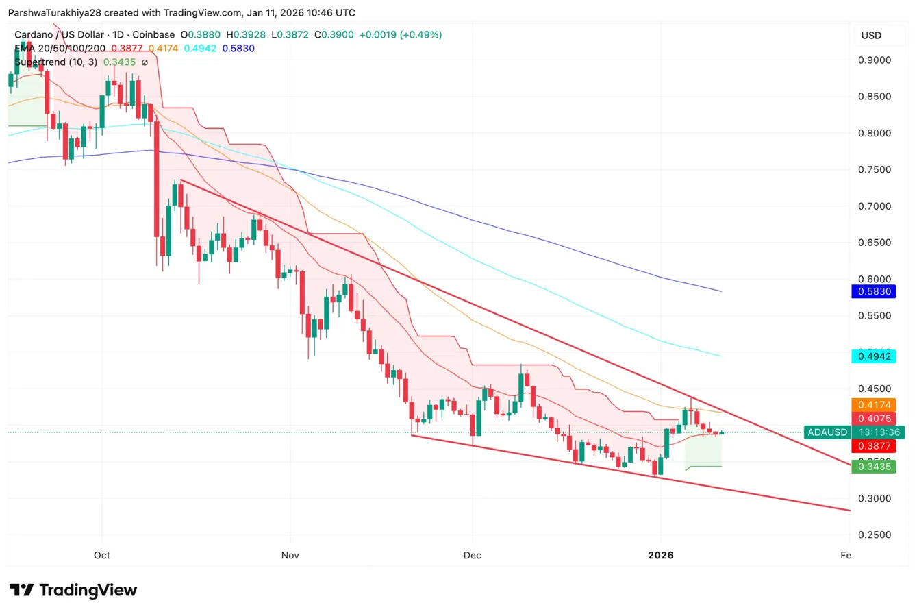 Esse cenário se formou depois que a ADA tocou US$ 0,4374 em 6 de janeiro, ultrapassando a EMA de 50 dias pela primeira vez desde outubro. No entanto, o rompimento falhou e o preço recuou por quatro sessões, retornando abaixo da média e reforçando a atual compressão gráfica.