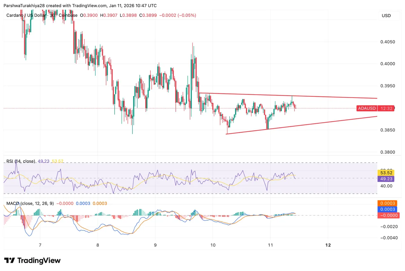 No gráfico de 30 minutos, a ADA permanece consolidada perto do ápice do triângulo. A resistência em US$ 0,393 continua sendo testada, enquanto o suporte em US$ 0,385 impede quedas mais fortes. O RSI em 49,23 mostra neutralidade, e o MACD está estável, reforçando equilíbrio entre compradores e vendedores.