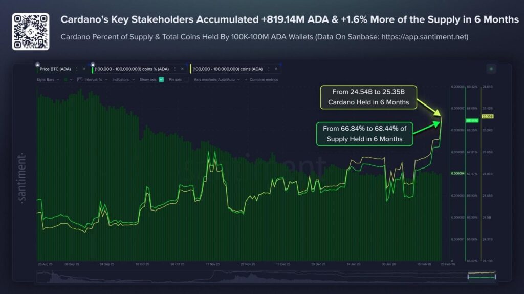 Wallets holding between 100,000 and 100 million ADA collectively added more than 819.4 million ADA, even as the price dropped from $0.90 to $0.26. Such accumulation patterns often indicate long-term confidence from major investors, providing a foundation for sustained price support.