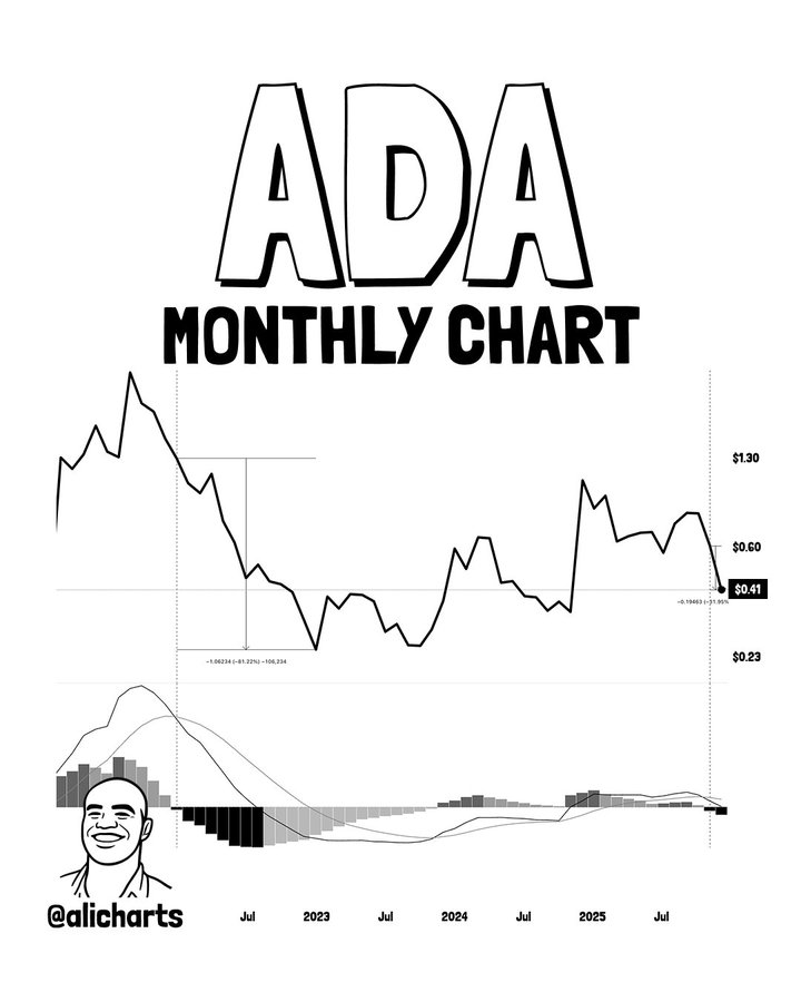 Cardano (ADA) faces renewed scrutiny as market signals hint at further losses. Analyst Ali Martinez warns that the last monthly MACD bearish crossover preceded an 81% plunge, raising investor caution.