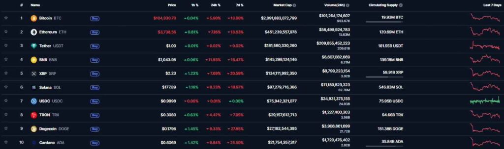 The losses were universal for the top 10 assets by market capitalization, as they were all in the red on the daily chart. Bitcoin (BTC) is down 5.60% as of the time of writing, while Ethereum (ETH) has dropped more than 7.16%.