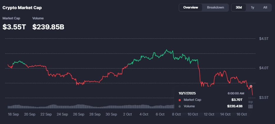 The cryptocurrency market lost $150 billion in value in a matter of hours on Friday, October 17, further escalating its continuing downtrend.