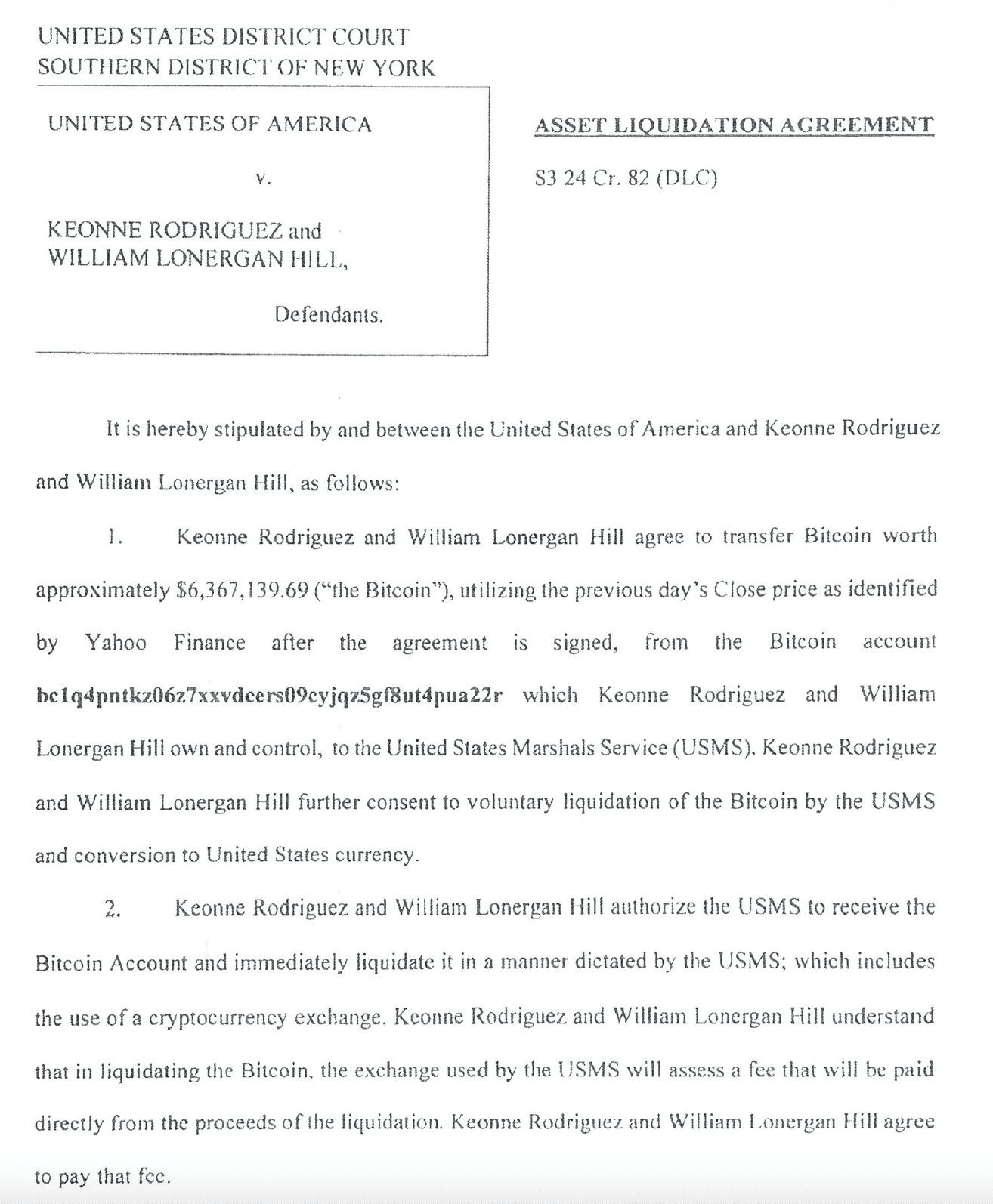 The claim is based on an unpublished document titled “Asset Liquidation Agreement”, reviewed by Bitcoin Magazine, noting BTC that Rodriguez and Hill forfeited “will be sold, or already has been.”