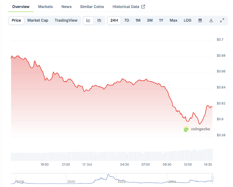 According to data from CoinGecko, Cardano is trading at $0.616, marking an 8.98% drop in 24 hours and a 24.46% decline over seven days.