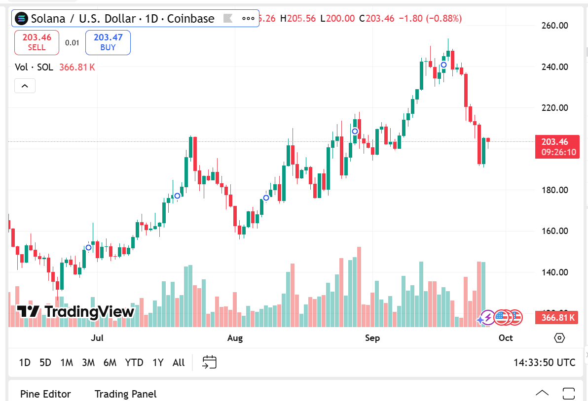 Solana (SOL) is now trading at $203.46, a 3.34% gain over the past 24 hours. The $110.16 billion market capitalization of the network indicates the strength of its DeFi ecosystem, though its last day's trading volume declined 33.41% to $7.48 billion, signaling short-term trader caution.