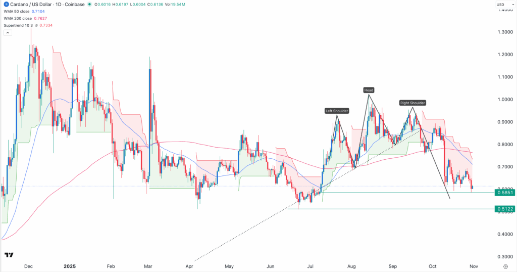 The daily chart shows that the ADA price has plunged to a low of $0.6180 and technicals suggest that a steeper crash is coming.