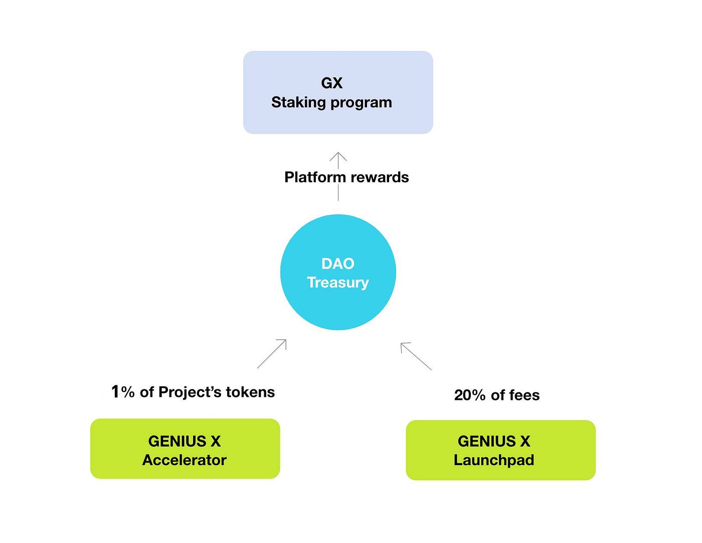 - Redistribution of one percent of each Genius X Accelerator Program clients’ total token supply. Rewards will be in the clients’ native token and distributed from the Genius X DAO Treasury.
