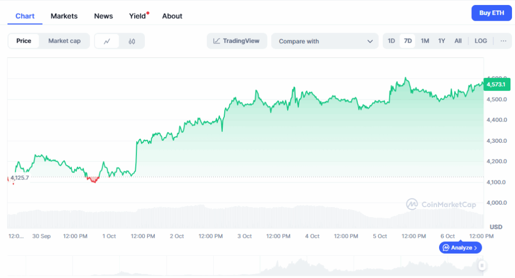 Ethereum (ETH) è attualmente scambiato sopra i $4.500 con un guadagno del 12,9% nell’ultima settimana. L’azione del prezzo mostra una forte ripresa bull dal minimo di fine settembre intorno ai $3.900 verso la zona di resistenza a $4.600.