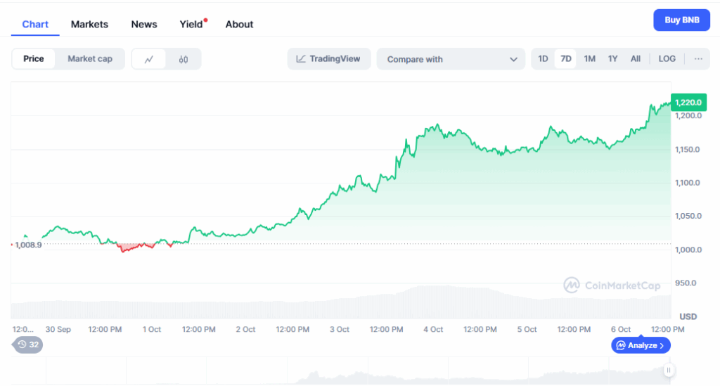 Il prezzo di Binance Coin è stato su una traiettoria ascendente nell’ultima settimana. I dati da CoinMarketCap rivelano che la moneta DeFi ha raggiunto un nuovo massimo storico di $1,190 il 3 ottobre.