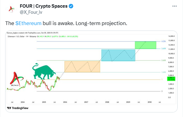 <blockquote class=”twitter-tweet”><p lang=”en” dir=”ltr”>Il bull di <a href=”https://twitter.com/search?q=%24Ethereum&src=ctag&ref_src=twsrc%5Etfw”>$Ethereum</a> è sveglio. Proiezione a lungo termine. <a href=”https://t.co/Mi9bkS49uL”>pic.twitter.com/Mi9bkS49uL</a></p>— FOUR | Crypto Spaces (@X_Four_iv) <a href=”https://twitter.com/X_Four_iv/status/1974791687651401886?ref_src=twsrc%5Etfw”>5 ottobre 2025</a></blockquote> <script async src=”https://platform.twitter.com/widgets.js” charset=”utf-8″></script>