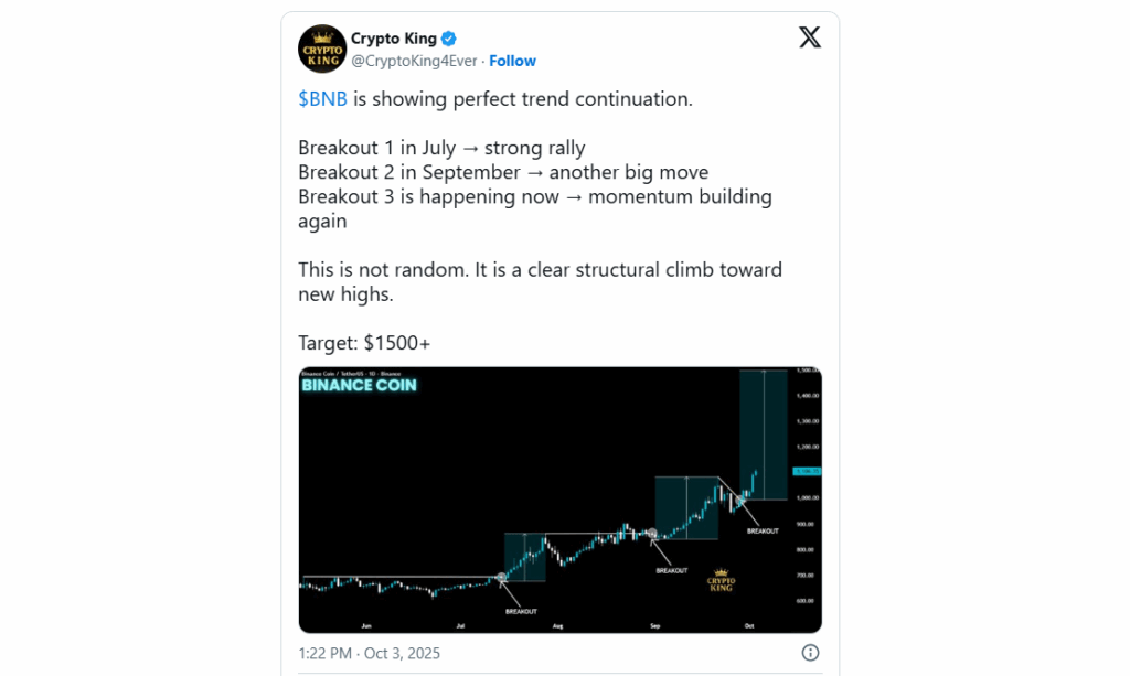 <blockquote class=”twitter-tweet”><p lang=”en” dir=”ltr”><a href=”https://twitter.com/search?q=%24BNB&src=ctag&ref_src=twsrc%5Etfw”>$BNB</a> sta mostrando una perfetta continuazione del trend.<br><br>Breakout 1 a luglio → forte rally<br>Breakout 2 a settembre → un altro grande movimento<br>Breakout 3 sta accadendo ora → il momentum si sta costruendo di nuovo<br><br>Questo non è casuale. È una chiara salita strutturale verso nuovi massimi.<br><br>Obiettivo: $1500+ <a href=”https://t.co/ViMsWeUIm1″>pic.twitter.com/ViMsWeUIm1</a></p>— Crypto King (@CryptoKing4Ever) <a href=”https://twitter.com/CryptoKing4Ever/status/1974087634671878312?ref_src=twsrc%5Etfw”>3 ottobre 2025</a></blockquote> <script async src=”https://platform.twitter.com/widgets.js” charset=”utf-8″></script>
