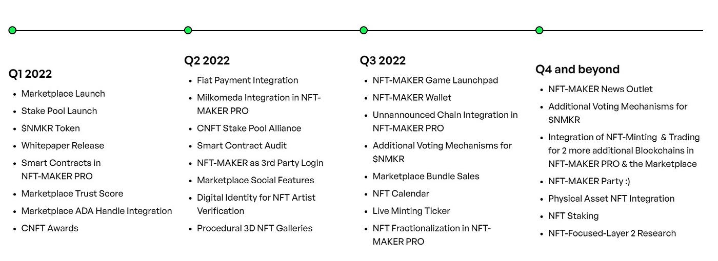 The roadmap includes the release of the $NMKR token, NFT marketplace, Fiat payment integration, Milkomeda integration, NFT-MAKER as 3rd party login, and digital identity for NFT artist verification.