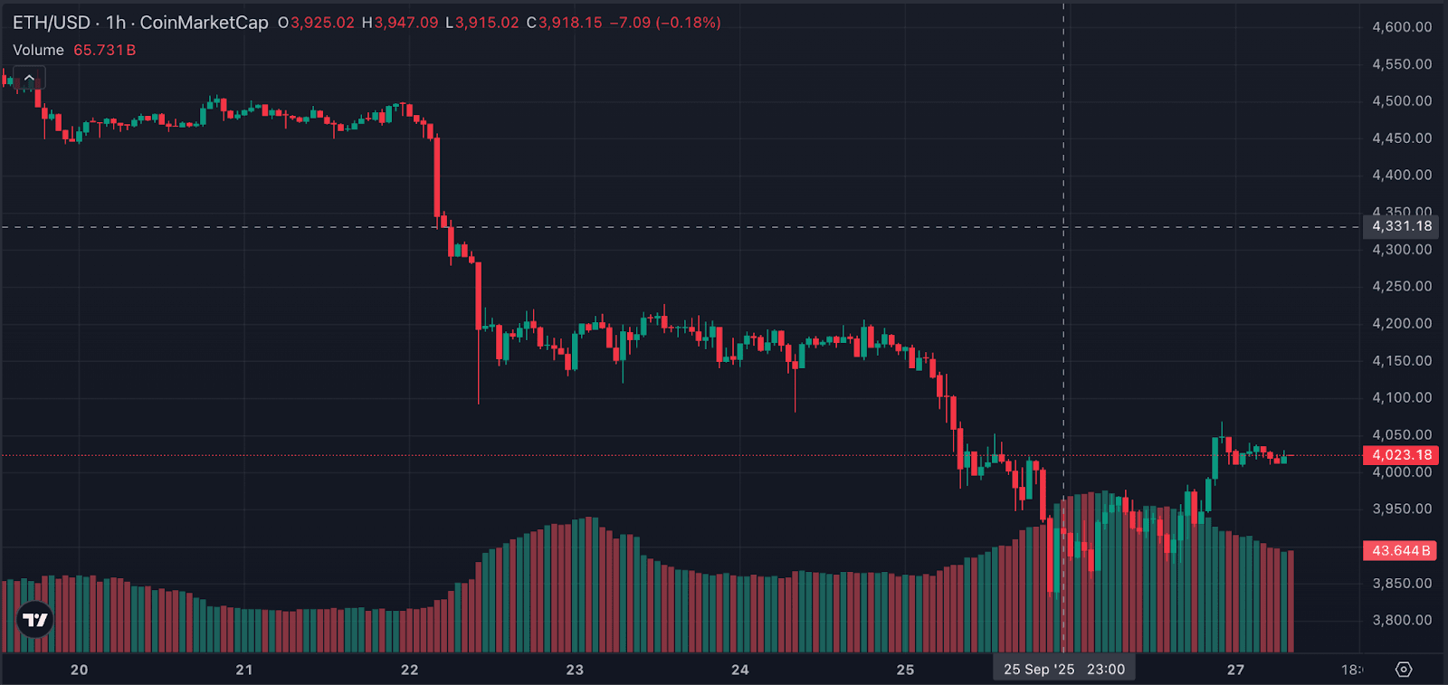 The supply of ethereum stablecoin grew to more than 160 billion in September 2025, indicative of a strong liquidity position. This increased a 14 % gain in AI tokens and brought in ETF inflows of over $980⁻ million. Nonetheless, Ethereum fell 7.6 per cent in a week to prices of $3,945 during outflows worth $217 million. The bear futures forced ETH below the vital level of 4,000 to indicate consolidation, as opposed to a collapse.