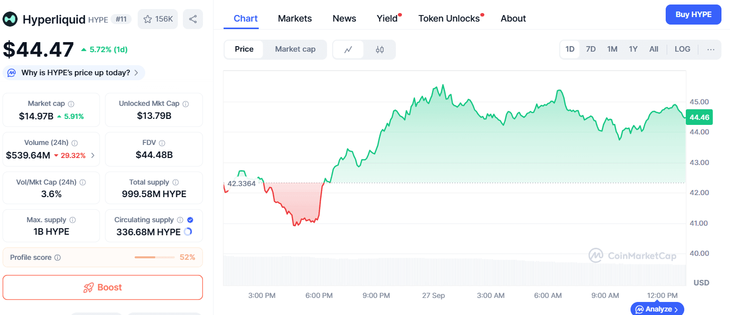 Hyperliquid operates as a decentralized exchange built on its custom Layer-1 blockchain. It focuses on offering perpetual derivatives and fast execution while keeping transaction fees low. HYPE is trading at 44.47 and has a capitalization of 14.97 billion. The circulating supply is 336.68 million tokens for a total of 1 billion. The average daily trade is 539.64 million. The analysts highlight its dual design, which incorporates the characteristics of decentralized and centralized platforms. Hyperliquid targets professional traders with sophisticated tools on a decentralised infrastructure.