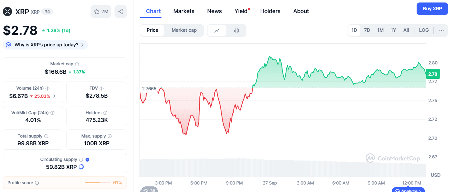 XRP was created by Ripple Labs in 2012 to improve cross-border payments. In its XRP Ledger operation, it takes three to five seconds to settle. XRP is listed on the market at $2.78 at a market cap of $166.6 billion. The initial amount of supply is 59.77 billion out of 100 billion. The daily trading is $6.67 billion. Analysts point out its synergies with banks and payment networks as a strength. Compared to other decentralized tokens, XRP is institutional-friendly, which makes it an independent participant in the international payment industry.