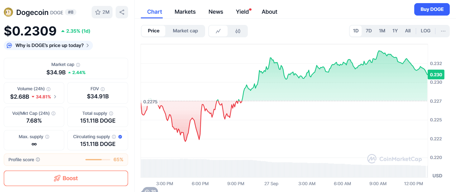 Dogecoin was initiated in 2013 as a meme cryptocurrency but turned out to be one of the most well-known digital tokens. It has a reputation for having low fees and great relevance of culture, which is enabled by a large online community. DOGE trades at $0.2309 and its market capitalization stands at $34.9 billion. The daily volume exceeds $2.68 billion, and its supply in circulation is 151.11 billion tokens. The unlimited maximum supply raises questions about long-term scarcity, though its liquidity and brand recognition keep it relevant. Analysts stress that Dogecoin thrives on community engagement but lacks advanced technical development compared to other assets.