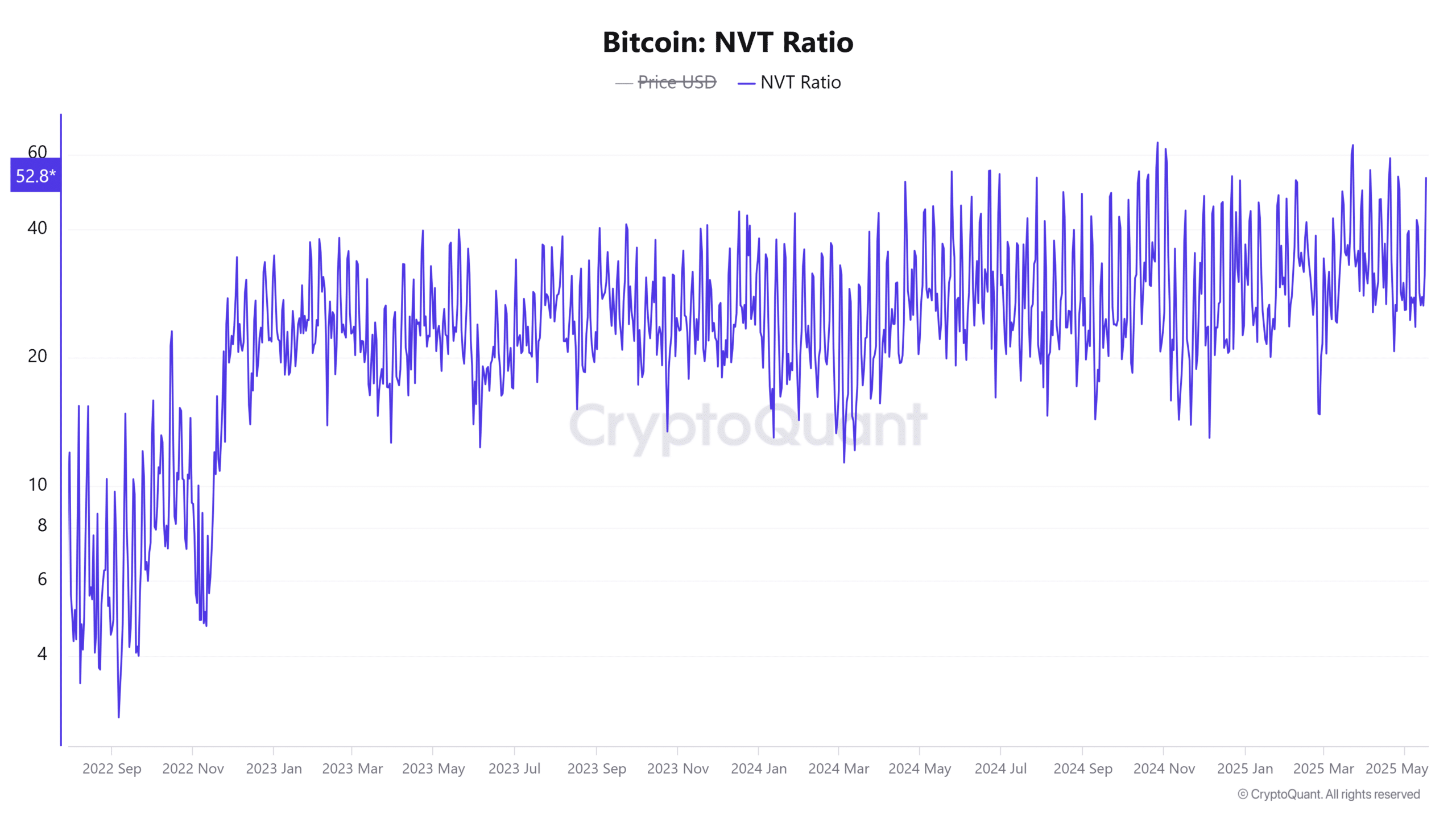 Le ratio de la valeur du réseau / de la transaction (NVT) a grimpé de près de 70% pour atteindre 52,81. Cette forte augmentation implique que la capitalisation boursière de Bitcoin augmente plus rapidement que le volume transféré réel en chaîne.