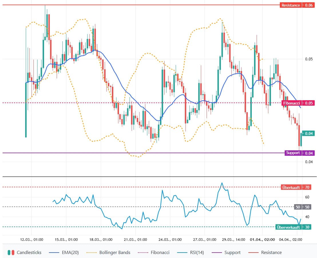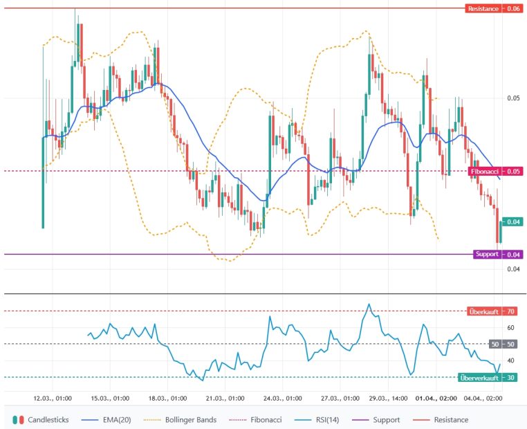 Der Kurs notiert deutlich unter dem EMA-20 (0,04522 US-Dollar) und bildet zuletzt eine Sequenz tieferer Hochs und Tiefs, was kurzfristige Schwäche signalisiert. Direkte Unterstützungen sind 0,04086 US-Dollar (aktuelles Tief) und rund 0,04322 US-Dollar (Bollinger-Unterband); Widerstände bei 0,04471 US-Dollar (letzte Hochs) und 0,04522 US-Dollar (EMA-20). Solange der Kurs unter dem EMA-20 verbleibt, bleibt die Marktlage neutral bis leicht bärisch.