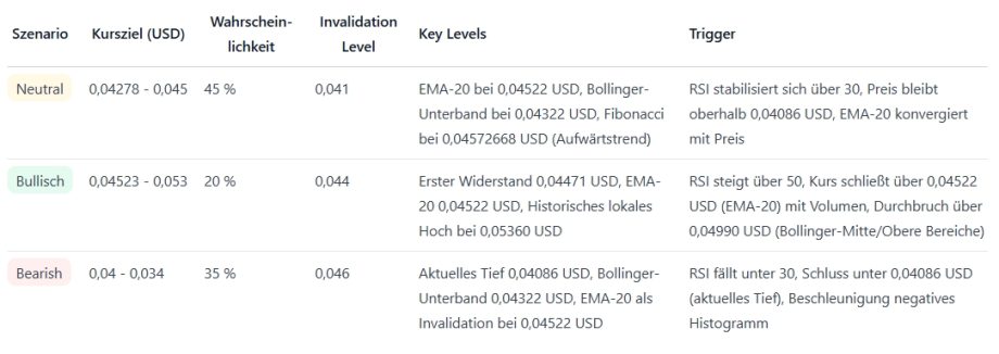 Die Bollinger-Bänder-Breite beträgt rund 0,00670 US-Dollar (Upper 0,04992 / Lower 0,04322 US-Dollar), was erhöhte, aber nicht extreme Schwankungen anzeigt. Marktphase: Konsolidierung mit erhöhter Unsicherheit nach dem Ausverkauf.