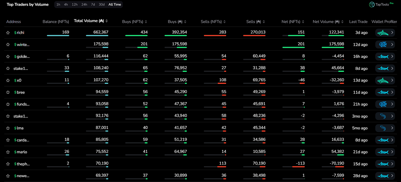 The current all time Top Trader for the Tappy collection has done over 660,000 ADA in volume, with 392,354 ADA of this being buy volume and 270,013 ADA in sell volume. The last trade this wallet made was 3 days ago and also happens to be the top Tappy holder.