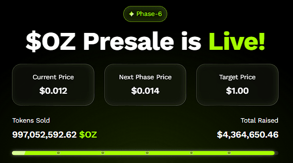 Yet, while Pepe’s momentum is undeniable, a different kind of project is rapidly gaining presale stage—one built not on memes, but on machine learning and real-world AI utility. Ozak AI, currently priced at $0.012 in its 6th OZ presale stage, has already raised over $4.2 million and sold more than 990 million tokens. Its potential, powered by artificial intelligence and blockchain integration, is making it the standout 100x contender for 2025 and beyond.