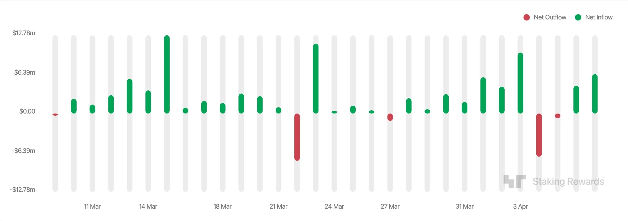 Des données supplémentaires montrent que le capital s'écroule de plus en plus dans le réseau de jalonnement de Polkadot. Au cours des 30 derniers jours, DOT a appris des entrées de jalonnement supplémentaires à tous les quatre jours. Ceci est remarquable car d'autres jetons populaires tels que Ethereum et Solana ont subi des drains considérables dans des cours de chute.