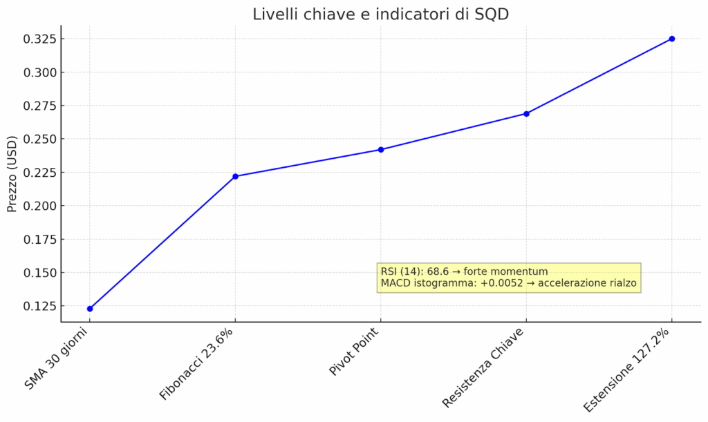 SQD ha superato la sua media mobile semplice a 30 giorni ($0,123) e il ritracciamento di Fibonacci del 23,6% ($0,222), testando ora il punto pivot a $0,242.
